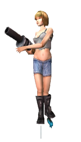 Angelyss is the leader of a gang of berserker beauties. A hunter since her teenage years, Angelyss is not one to take lightly. She originated from the Land Behind The Seven Ridges, where she was hunting for a living. Once when she was trapped by a mutant tiger, a void opened up that took her into the Arena. She reasoned that a survival horror with unlimited lives is better than a one with a single life. With some experience in the Arena, she learnt that running practically naked is actually more effective in stopping bullets than thick armor, as her opponents are mainly males. She uses a shock-and-awe strategy to paralyze other opponents, and to deepen the effect she wears very scarce clothing, consisting only of a rope and some straw, with armblades and a winged helmet. She established a gang accepting any girls with decent looks to accompany her. (See Angelyss).