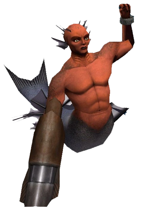 Merman was forced from his underwater home of Atlantas at a young age. He travels the universe looking for his lost home. Famous for his ruthlessness he was forced out when as a child after pushing his brother off a cliff. After this his rage exploded and he went on an orgy of killing and violence something he has been able to live in the Arena. To grow strong he drinks the blood of his enemies. He listens to Pink Floyd in his spare time. (See Merman).